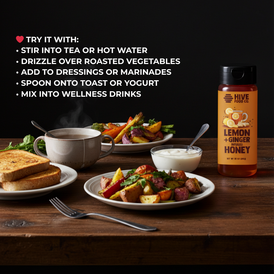 ✨ Flavor Profile: Bright Sicilian lemon peel and warming ginger root blended into smooth raw honey. Fresh citrus lifts the sweetness while ginger adds gentle heat, creating a vibrant, balanced honey that feels energizing and clean.